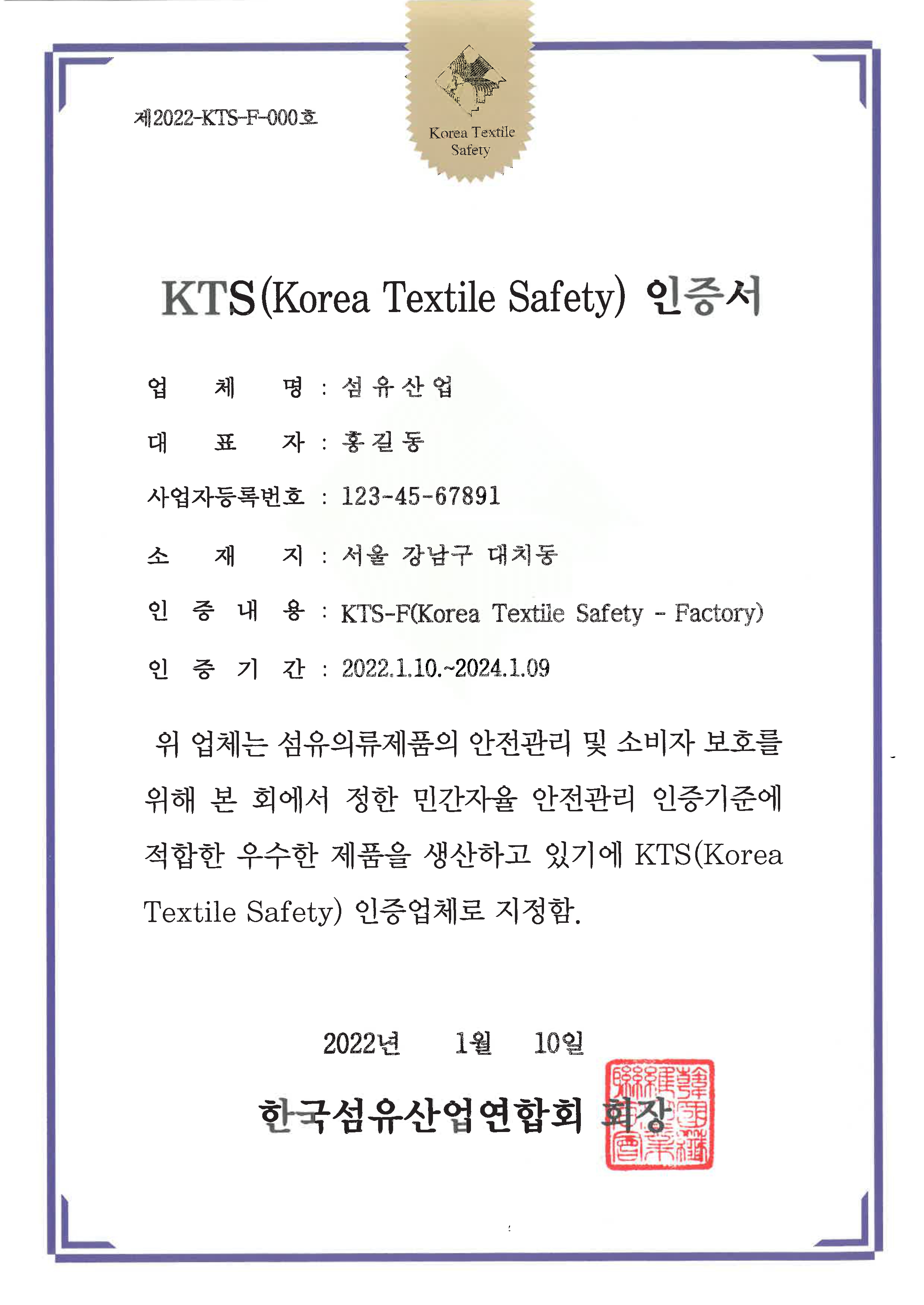 한국섬유산업연합회에서 인증업체에게 발행하는 공식 인증서입니다.